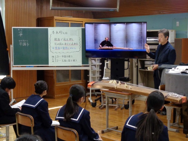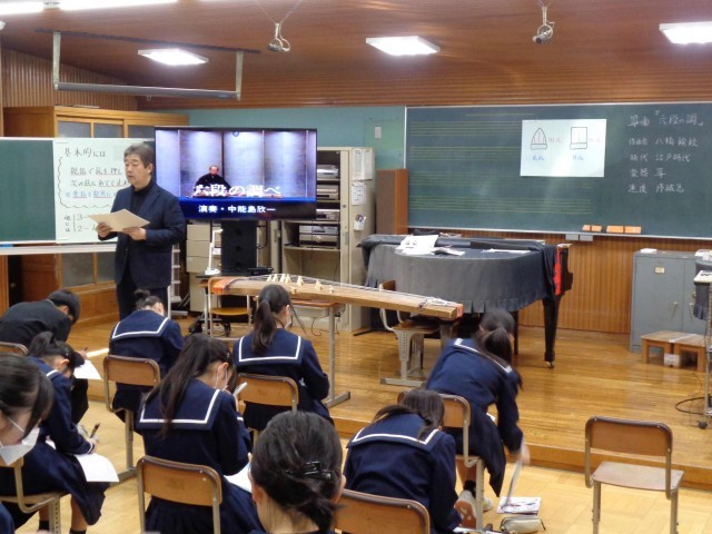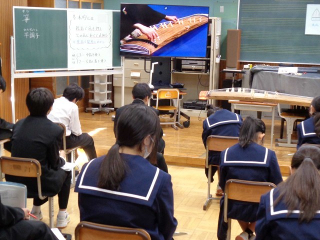 いよいよ3学期の授業が本格スタートです。1年3組の音楽では箏曲「六段の調」の鑑賞をしていました。新春にふさわしい音楽ですね。見事な演奏に、みんなじっくりと聴き入って、ワークシートに感想を書き留めていました。