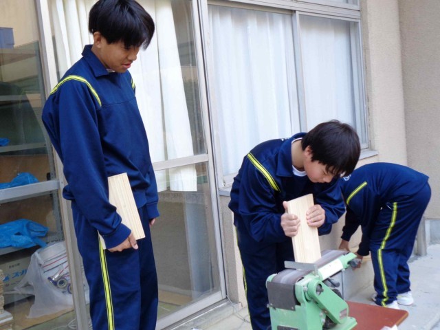 1年1組の技術科の授業は、木工製作の続きです。今日は、12月にカットした木材を機械をつかって研磨したり、組み立てるための目印をつけたりしていました。もうすぐ組み立ての工程にはいるかな?みんな一生懸命作業に取り組んでいました。