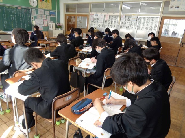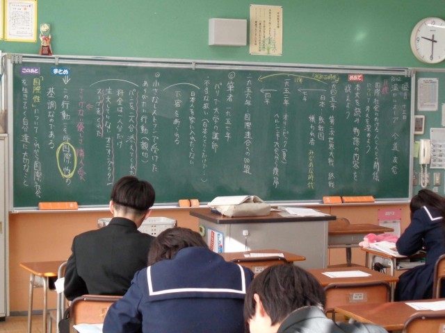 3年2組の国語では「温かいスープ」という題材を学習していました。「みらいに向かって」という国語の最後の単元で学ぶ文章です。題材の目標は「国際社会における人と人との関係について、考えを深めよう」。異国の地で働いていた筆者が、そこで出会ったさりげない親切について描かれています。筆者が何を訴えたいのか、について一人一人がじっくりと考えてほしい題材です。