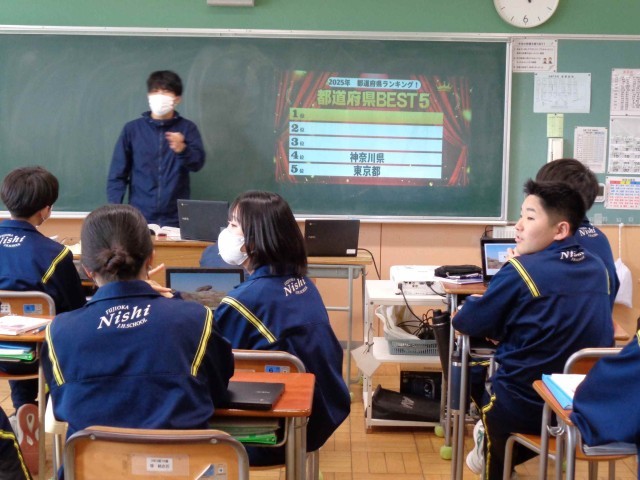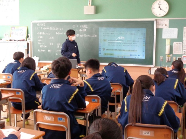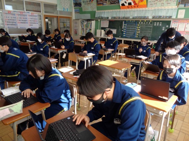3年3組の数学の授業で「都道府県ランキング」をあてるクイズを楽しそうにしていました。一体このクイズが数学にどのようにつながるのかな?と思ってみていると、ランキングをつけるための調査方法についてみんなで調べ始めました。この単元は3年生の数学の最後の単元で、「標本調査」について学びます。調査対象が多い場合に全員に尋ねるのは難しい。そこで集団から一部分を取り出して「標本」として調べるののが標本調査なのだ、ということを「都道府県ランキング」などの「ランキング調査」を調べることで具体的に理解できたようです。