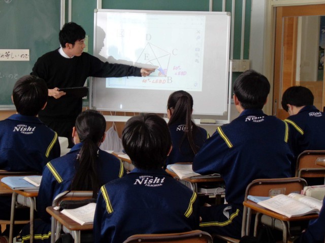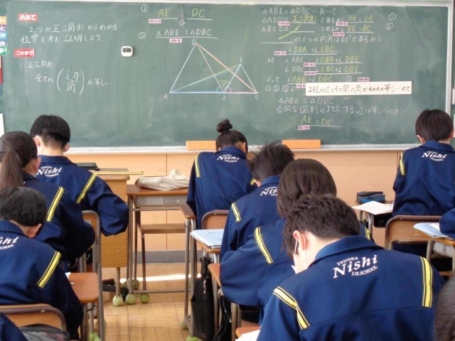 今日の2年1組の数学の授業のめあては、「2つの正三角形からわかる性質を考え、証明しよう」です。正三角形の性質を使うと、2つの直線の長さが等しいことを証明できる、という問題をみんなで解きました。「これまで」学んだ正三角形の性質の何をどのように使うと証明できるのか、よ~く考えて課題に取り組んでいました。