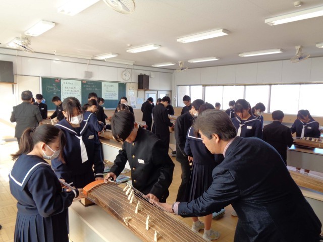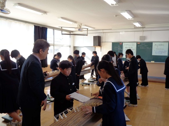 箏で「さくら」を練習中の1年生の音楽。2時間目の1年2組の音楽の授業は、校内研修の授業公開でした。今日のめあては「押し手を使って旋律部分を演奏しよう」です。押し手をつかって半音高い音を出す方法を教えてもらい、いざ実践です。「これまで」学習したことや今日の「押し手」についての説明がわかりやすく掲示されていて、「今日、何をするのか」がはっきりとわかり、一人一人がすすんで学習に取り組める工夫がされた授業でした。