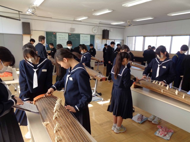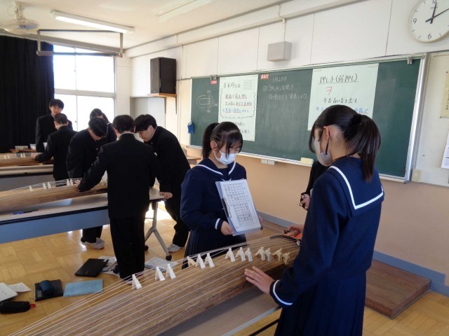 1年生の音楽の授業の様子。4時間目の1年1組も箏の練習です。みんな楽しそうにやる気をもって練習に取り組んでいました。次回はさらに難しいことをするようですが、みんなの意欲は高まるばかりです。