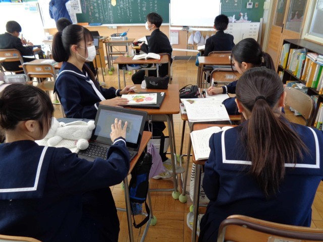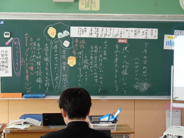 1年3組の国語の授業。先日紹介した「少年の日の思い出」で、「僕」の人物像について一人一人考える活動をしていました。グループや全体で活発に意見交流をして物語の内容にせまっていました。