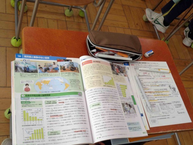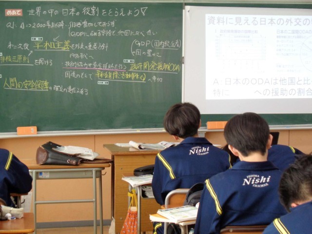 3年3組の社会科の授業では、「現代の国際社会」について学習中。今日は「世界の中の日本の役割」について調べました。様々な課題が山積する現在の国際社会において平和な世界を実現するために日本はどのような役割を果たせるでしょうか。資料映像を視聴したり、グラフなどの分析をおこなったりしてみんなで考えました。