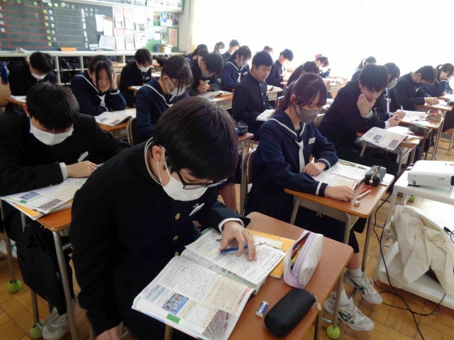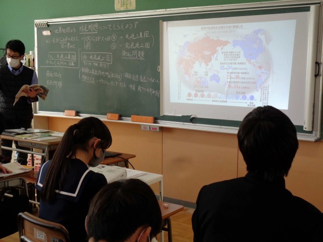 3年1組の社会科では世界の経済格差や貧困の問題について学習していました。先生がGDPの大きさで示された世界地図を提示し、「赤道を記入してみよう」と指示を出すと、南北の経済格差が視覚化されました。近年では以前「発展途上国」と言われた国々の中でも経済発展著しい地域もある中で、経済発展から取り残された国々も多くあり、「南北問題」以外に「南南問題」も生み出されていることも学びました。平和な世界のためには、経済格差や貧困の問題に世界各国が協調して取り組んでいく必要がありますね。