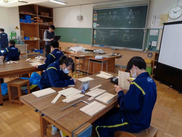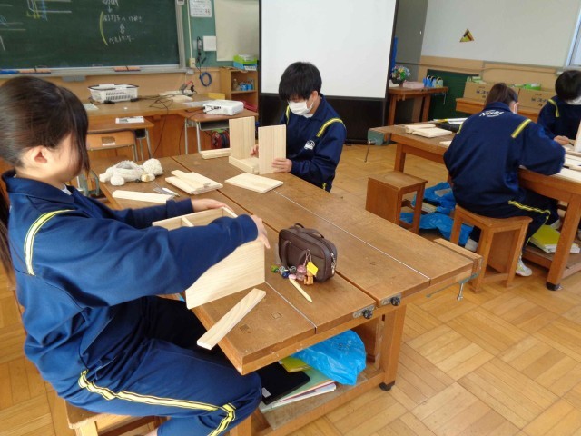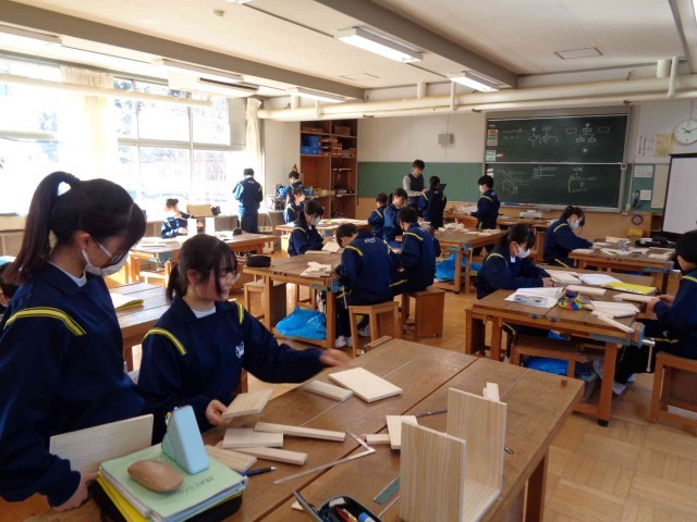 1年生技術科の木工製作もだんだんとゴールが見えてきました。今日の1年2組の授業では、木材の研磨作業の続きをしていましたが、研磨が終わってカットした木材に組み立てるための目印を書いている生徒がだいぶ増えました。完成目指して作業に意欲的に取り組んでいます。