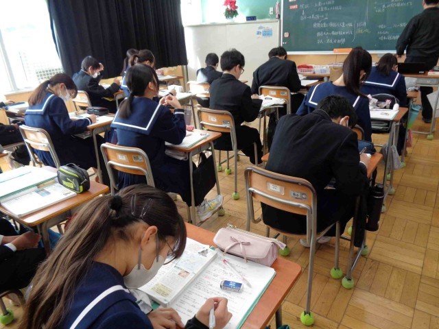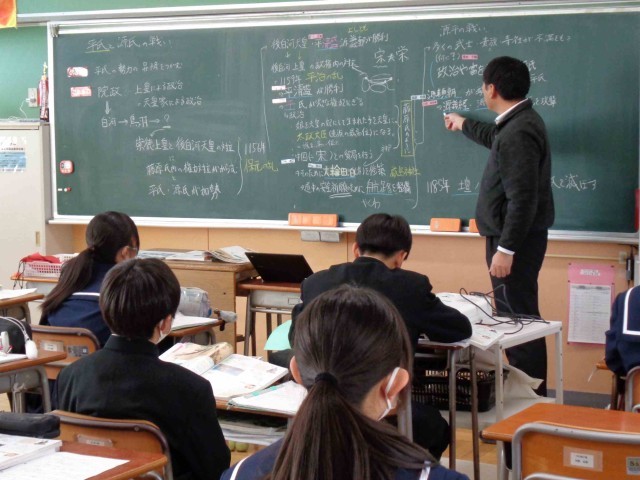1年1組の社会科は平安時代の学習で、平氏の盛衰について学習しました。貴族にかわって武家が政治の実権をどのように握っていったのか、なぜ平氏が滅亡したのかをワークシートを使って調べました。先生の発問に活発に答えながら積極的に授業に取り組んでいました。最後に源平合戦について国語の資料集を使いながら国語との関連もはかっていました。