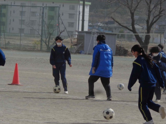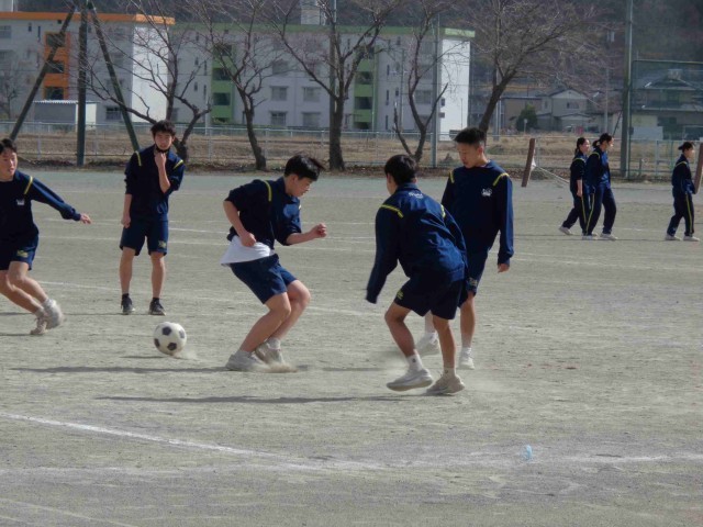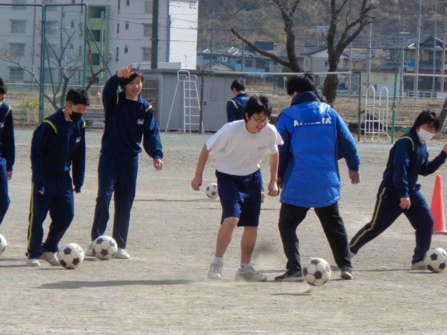 寒くてもサッカーの練習に元気に取り組む3年生の保体。今日の3年2組の授業では、授業の空き時間を使ってサッカー部の顧問の先生がゲストティーチャーとして授業に参加してくれました。先生の参加で生徒達も意欲も大いに高まり、楽しそうにプレーをしていました。