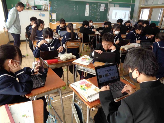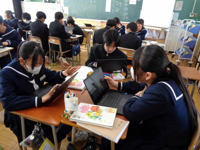 先週、ヘッセの「少年の日の思い出」を学習していた1年生の国語。1年2組ではまとめで作成していた新聞作りが終わり、今日は漢字についての学習です。これまで漢字についてはへんやつくりなど「漢字の組み立てと部首」、読み方の「漢字の音訓」を調べてきましたが、ここでは「漢字の成り立ち」を学びます。めあては「漢字はどのようにしてできたのだろうか」グループで協力してタブレットを使って調べていきます。