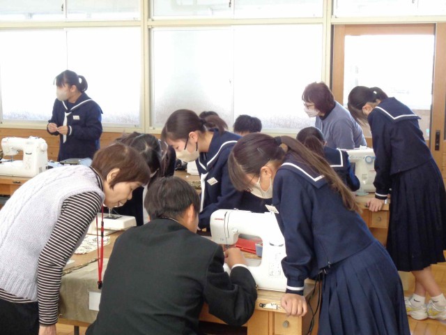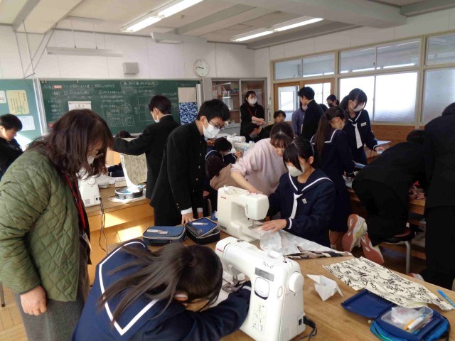 今日の1年生の家庭科では。防災リュックをミシンを使って縫うのでボランティアさんが外部講師としてミシンの操作や縫い方について支援をしてくださいました。4人のボランティアさんが各グループをまわって支援をしてくださるので、生徒達もとても心強かったと思います。写真は1組の様子。みんな一生懸命作業に取り組みました。