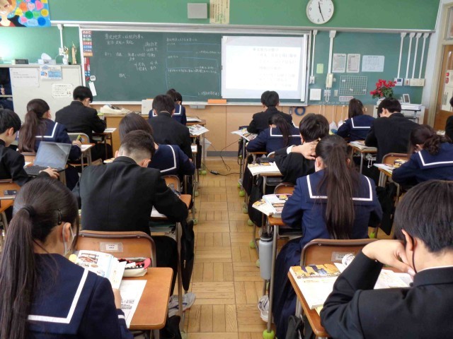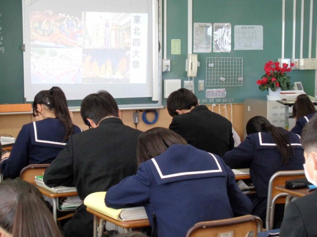 2年生の社会科は東北地方について学習中。今日の2年1組は東北地方の伝統行事や生活文化の変化について学びました。先生がスクリーンで竿燈やねぷたなどの東北四大まつりの画像を紹介して生徒達の興味を高めます。教科書や資料集、タブレットを使ってワークシートの課題を意欲的に調べていました。