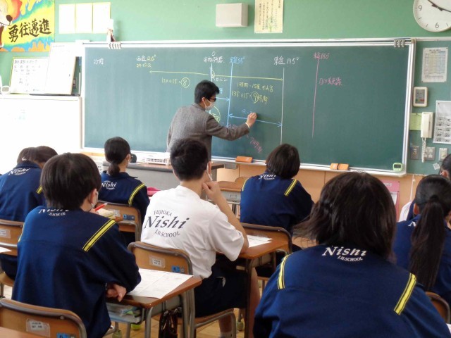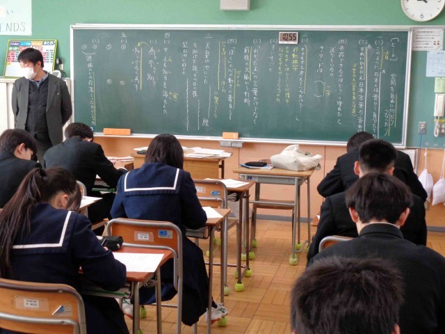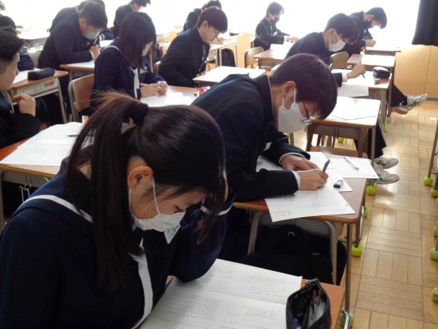群馬公立の高校入試を来週に控え、3年生の授業では復習問題に取り組む学習が多く見られます。今日の3年2組の社会では復習プリントを解きながら、間違えやすい時差の問題について先生が解説していました。先生の問いかけに活発に発言しながら問題に取り組んでいました。