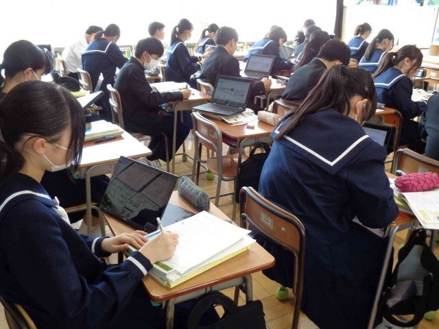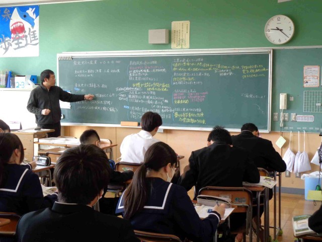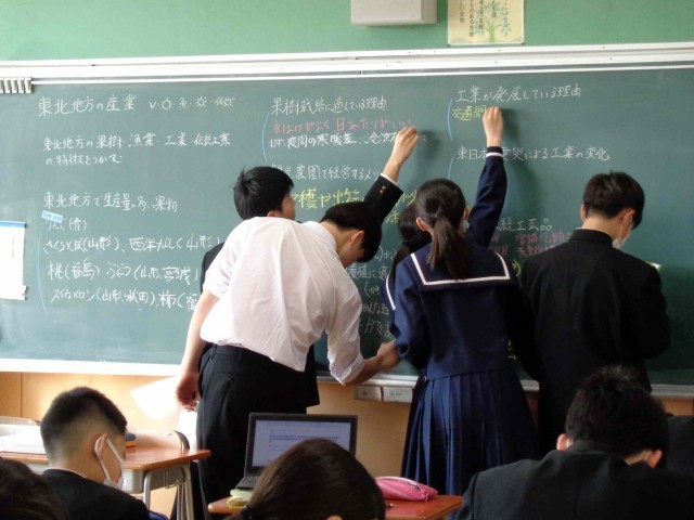 2年3組の社会科の授業。東北地方の特色についての学習のまとめをしていました。ワークシートを使ってこれまで学習してきた東北地方の産業を果樹栽培・漁業・工業・伝統産業についてその特徴や理由についてまとめます。黒板に生徒が調べたことを書いて全体で共有し、単元の学習内容をしっかりと確認できました。