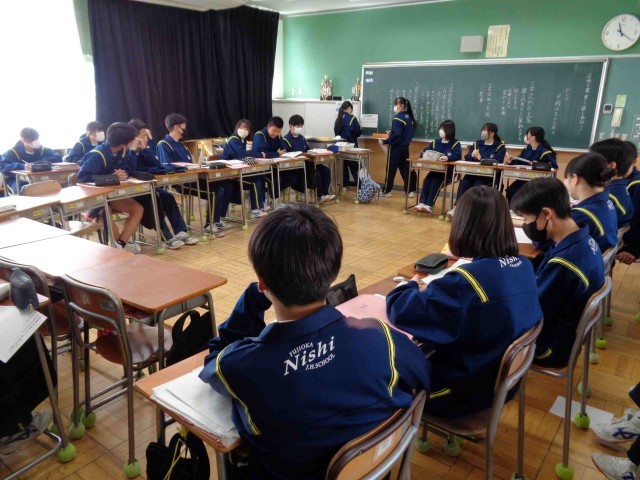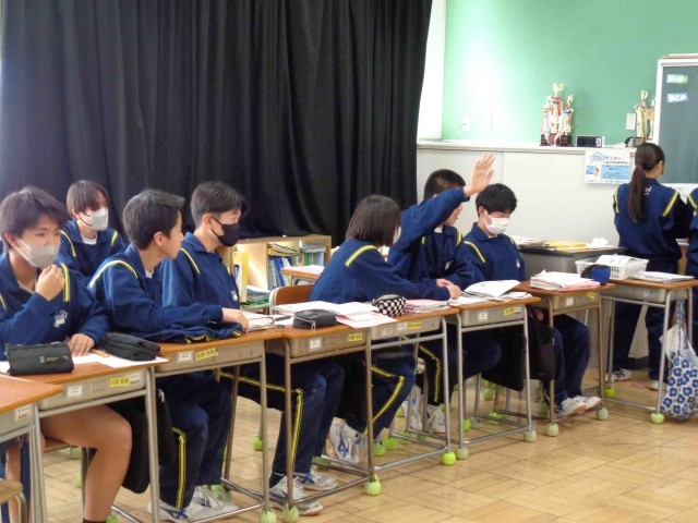 「立場を尊重して話し合おう」という討論についての学習をしている2年2組の国語。先週は立場に分かれて意見をまとめていたので、いよいよ今日は肯定派、反対派に分かれての討論です。テーマは「18歳は大人である」。それぞれの立場で根拠をもとに意見を述べ、相手の意見に対して反論していきます。相手の意見をよく聞かないと的確な反論ができませんね。チーム内で作戦を話し合ったり積極的に発言したりと意欲的な取り組みが光りました。司会進行や記録も生徒達が行い、とてもよい討論の活動ができていました。