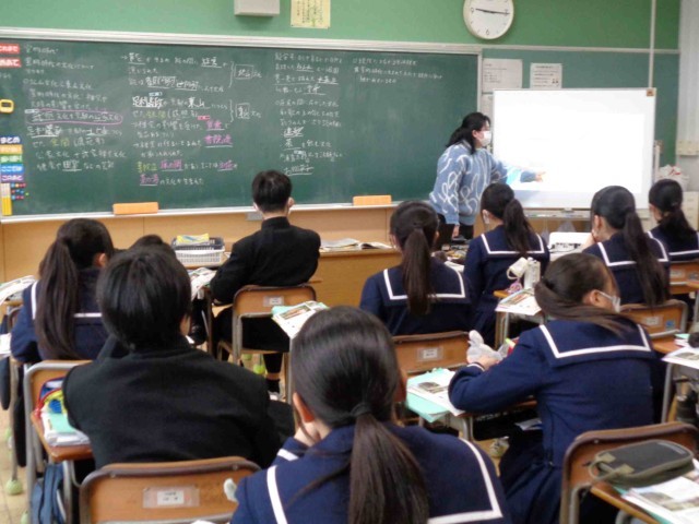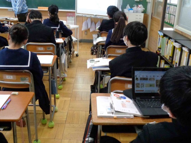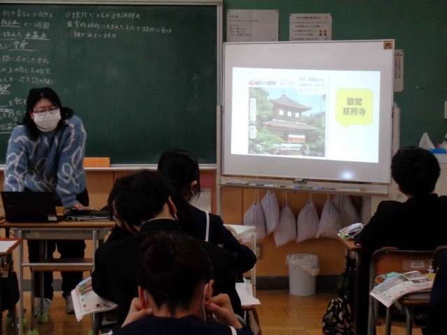 1年2組の社会科では、室町時代の文化について学習していました。ワークシートの課題を教科書・資料集・タブレットなどの資料をつかって調べ、室町時代の文化の特色をとらえます。全体での確認では先生が金閣や銀閣、書院造などの画像を見せてくれて、具体的でわかりやすく特色を理解することができました。