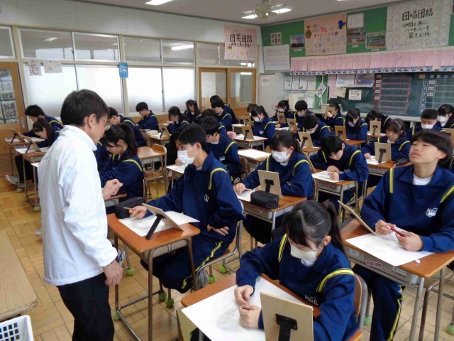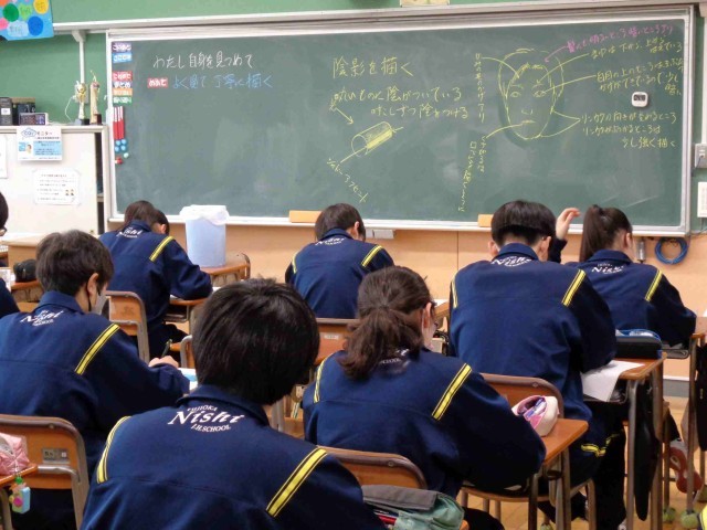 自画像の制作に取り組んで椅子2年生の美術。今日の2年1組の授業では、「陰影をつける」工夫をしながら、めあての「よく見て、丁寧に描く」に迫りました。先生の板書での説明がとても分かりやすい。みんな無言集中でじっくりと作品制作に取り組んでいました。