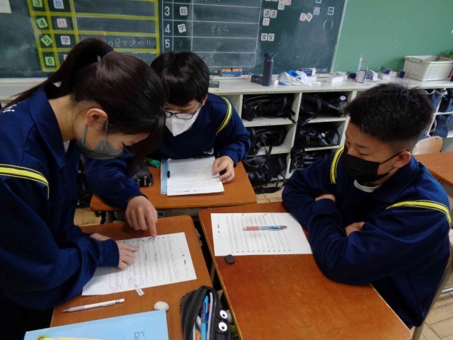 できたら、先生たちにチェックしてもらい、次の封筒に挑戦です。どのチームが一番に全部の問題をクリアできるかな?グループで楽しそうに問題を解きながら、3年生の英語の復習をしていました。