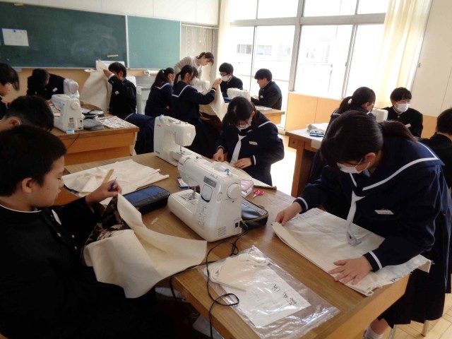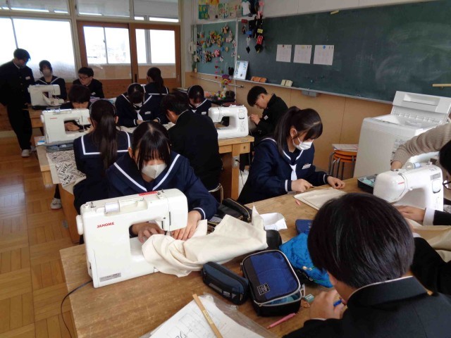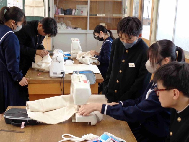 防災リュックを作成中の1年生の家庭科。今日の1年1組の授業では、ひもを通すところを縫っていました。まち針をうってミシンで丁寧に縫います。完成までもう一息。楽しみですね。