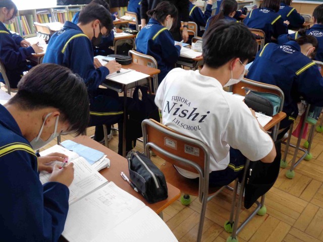 「データを比較して判断しよう」という最後の単元に入った2年生の数学。今日の2年2組では「四分位数と箱ひげ図」を使って複数のデータを比較する方法を学習しました。先生の箱ひげ図についての説明を聞いて、早速課題に取り組みます。よく考えてじっくり課題に向き合っていました。