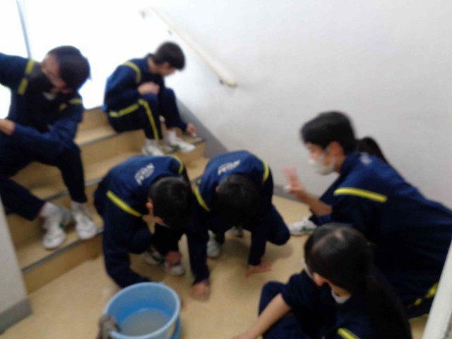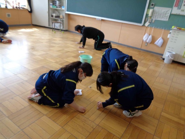 卒業式1週間前。高校入試も終えて、今日は3年生が愛校作業に取り組みました。これまでお世話になった感謝の気持ちを込めて大掃除。床をピカピカに磨いたり、窓を拭いたり、庭の草むしりをしたり掲示物を剥がしたり・・・と様々な作業に取り組みました。卒業に向けて最後の掲示物も作成中。いよいよ来週は中学校生活最後の1週間です。