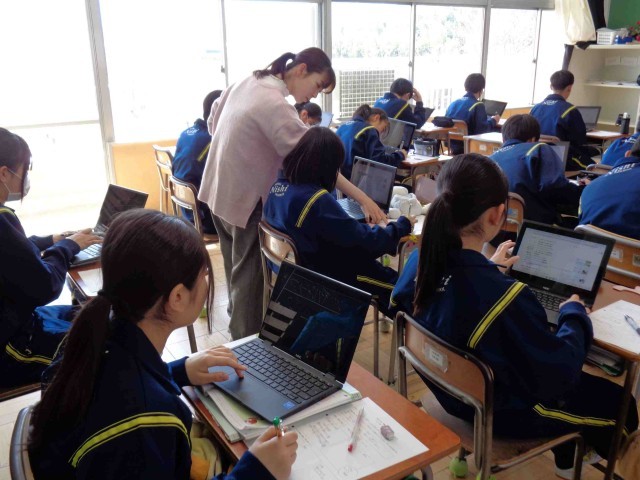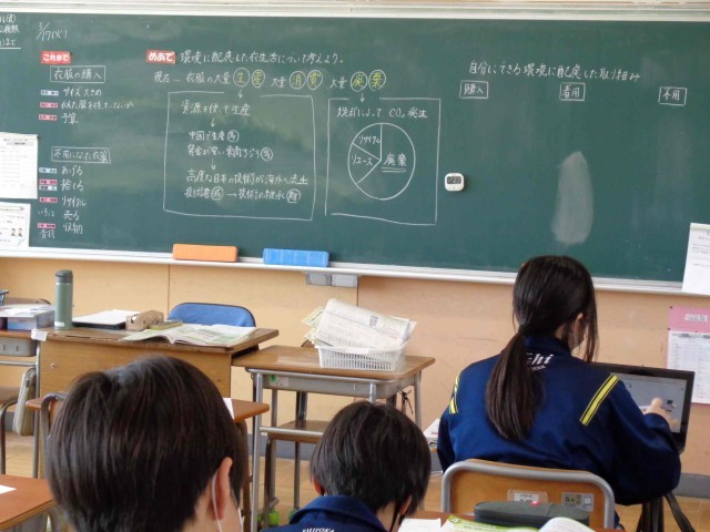 1年3組の家庭科では、「衣服の購入」について学習していました。授業のめあては「環境に配慮した衣生活について考えよう」です。大人になるにつれて、自分で判断し選択して衣服を購入していくことになりますが、そこで必要な視点は何かな?「大量生産・大量消費」による衣服の大量廃棄をこのまま続けていくと、資源の枯渇や環境問題へとつながっていきますね。これからの生産者や消費者に必要な考えが「SDGs」。今日の授業でも「自分にできる環境に配慮した取り組み」は何かを「購入」「着用」「不用」の3つの場合について、一人一人が考えたり調べたりしてワークシートにまとめました。みんな自分事としてしっかりと考えることができていました。
