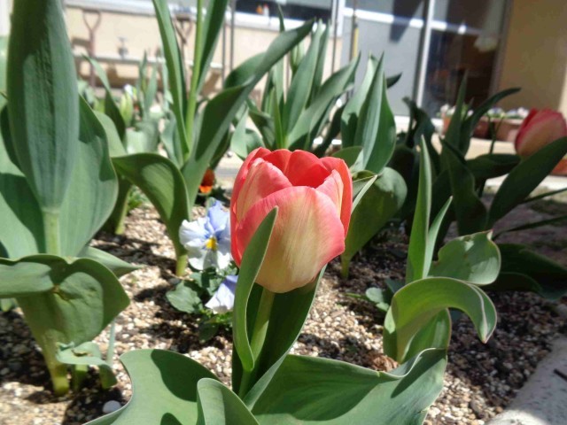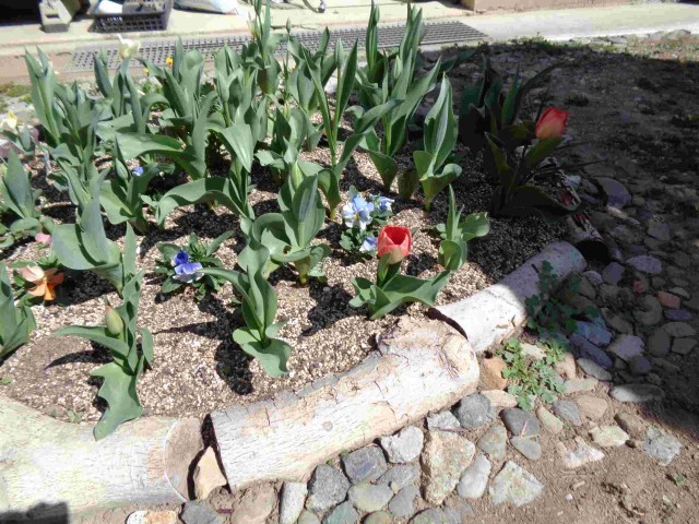 先週、ようやく白いチューリップが咲いた中庭の花壇。今日は赤いチューリップが咲き始めました。他の色のチューリップも蕾が大きく成長中。今週は別の色も咲くかな?もしかしたら、見頃は春休み中になってしまうかも・・・というのが目下の心配事です。