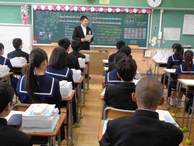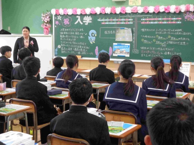 本日、午後は入学式が行われました。期待と不安でドキドキしながら1年生の教室に入ってきた新入生たち。黒板には歓迎の言葉が書かれ、担任の先生が優しい笑顔で1年生を出迎えました。入学式の説明をしてもらい、いざ出陣。緊張しつつも張り切って入学式に臨みました。