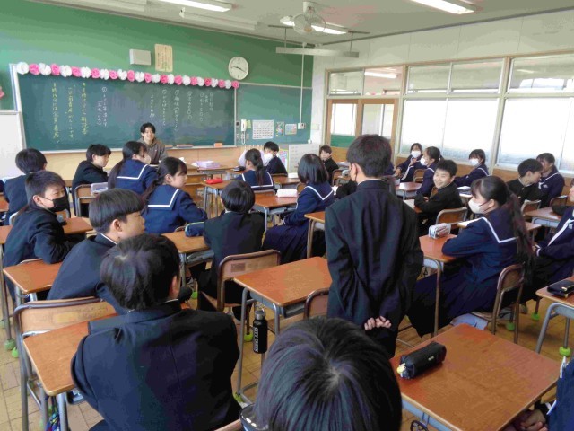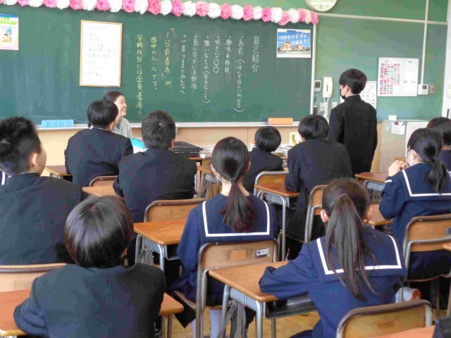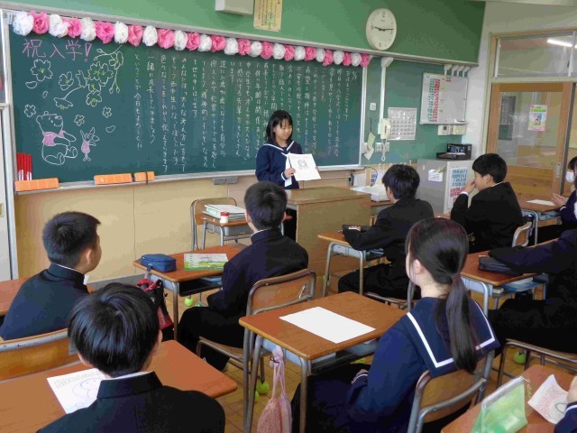 今日の1年生の1時間目は3クラスとも自己紹介タイム。3つの小学校から集まってきたので、「初めまして」の仲間がたくさんいます。これから仲良く過ごすためには、まずは自己紹介ですね。みんな工夫した自己紹介をしていました。ユーモアあふれる自己紹介で笑い声がたくさんあがり、どのクラスも楽しそうな笑顔あふれる自己紹介タイムでした。