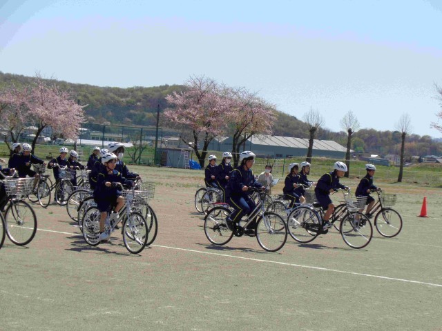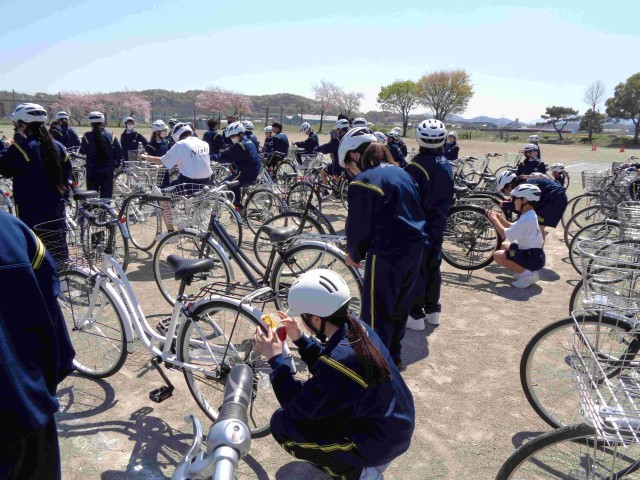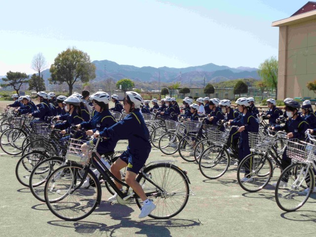 中学校に入学して、自転車通学や部活動の移動での自転車使用が始まるので、今日の3時間目は1年生の自転車交通安全教室。自転車の整備やヘルメットの着用、安全な自転車の走行について学び、みんなやる気満々でで取り組みました。
