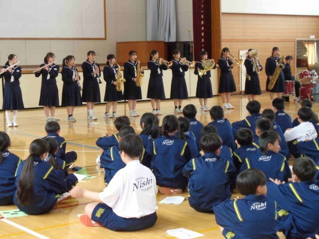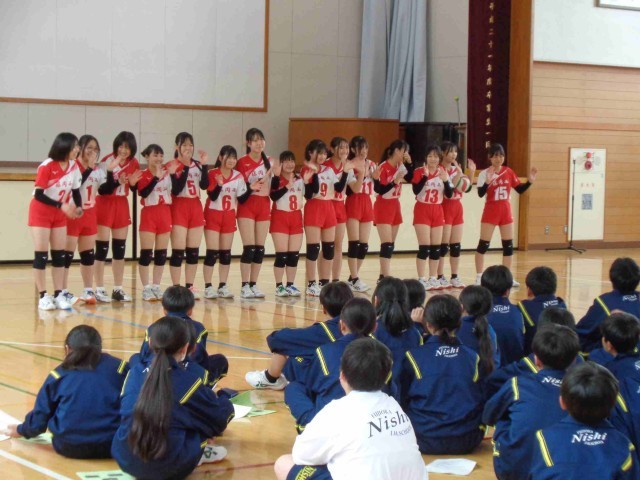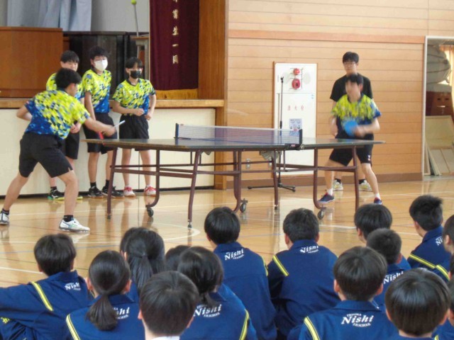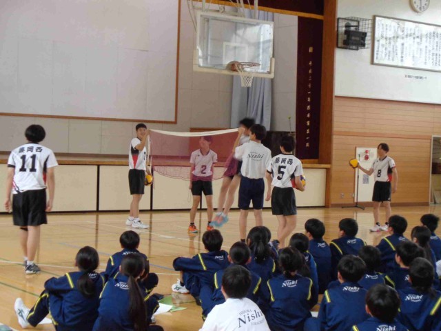 前半は生徒会本部と専門委員会が説明する西中学校の生活です。1日の生活の流れをロールプレイで分かりやすくかつユーモアたっぷりに説明します。楽しみながら西中学校での生活がとてもよくわかったと思います。