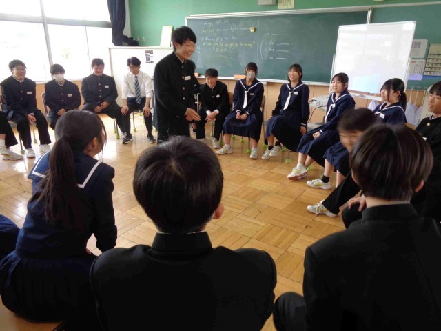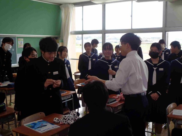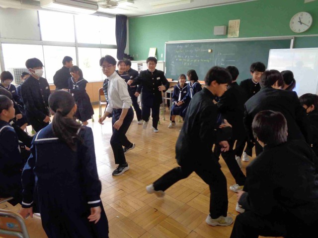2年2組の英語の授業。まずは「今朝、何時に起きたかな?」「〇時に起きました」と英語の質問に答える活動で、全員が先生と受け答えした後、全員で英語版フルーツバスケットでコミュニケーションを図りました。日本版フルーツバスケットの「〇〇の人」の代わりに「I have~」「I like~」「I can~」のいずれかを使った英語を言って、当てはまる人が席を立ちます。どんな英文を言うとたくさんの人が立ってくれるかな?知っている英語を思い出しながら楽しそうに活動していました。