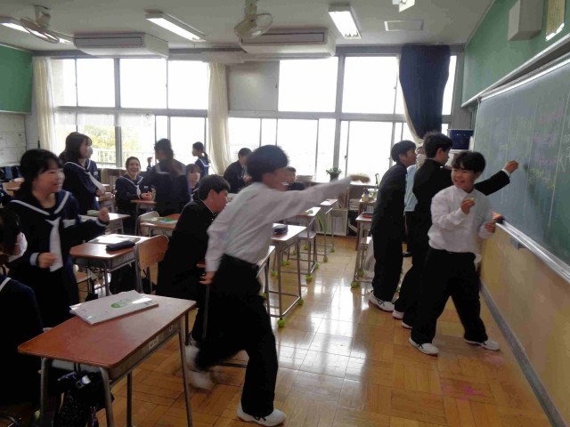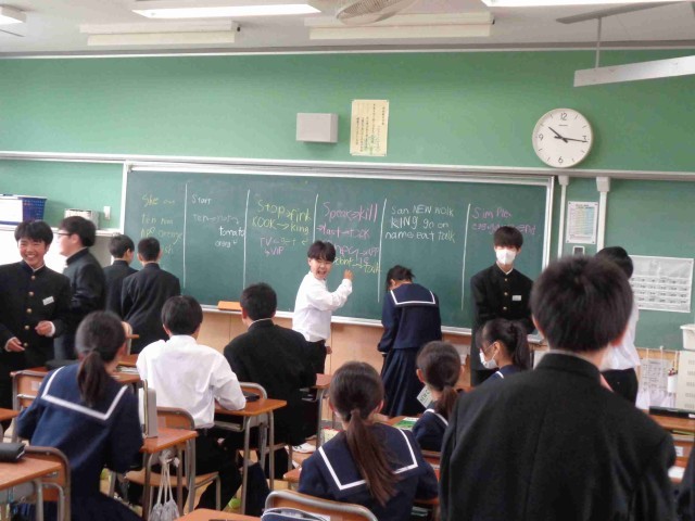 1年1組では中学校での初めての英語の授業。中学校での英語授業のガイダンスをしてもらった後、「英語しりとりゲーム」で小学校の英語活動の復習をしました。一生懸命単語を思い出して、チームで協力しながら英語で書いていました。