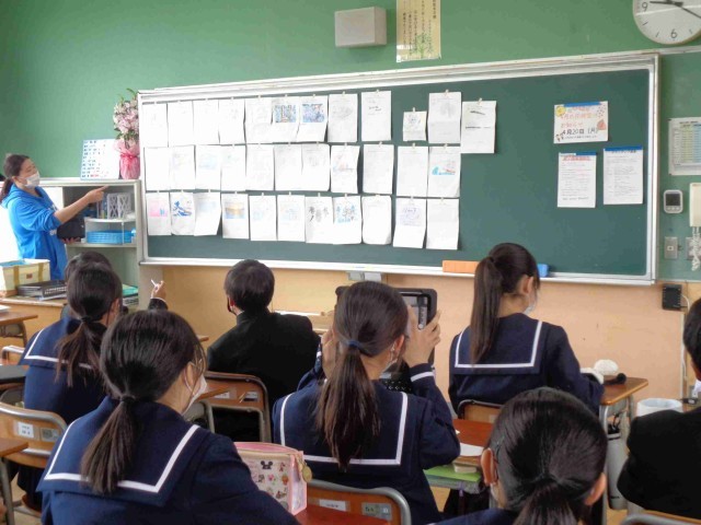 1時間目の1年生の学活。2,3組は学級器のデザインを決めていました。一人一人が考えてきたデザイン案から1つ選びますが、どの作品も力作ぞろいで1つに絞るのが難しい。みんなで話し合ったり投票したりして1つに絞りました。学級カラーを使ったデザインになりそうですね。