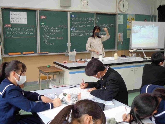 2年生の理科では「物質の成り立ち」について学習中。今日の2年1組の授業では「炭酸水素ナトリウムを加熱するとどのような変化が起きるだろうか」を実験結果をもとに考察する学習です。みんなで実験結果を確認した後、そこからどんなことがわかるのかをまとめました。先生の発問にみんな積極的に発言し、学習課題についてよく考えることができました。