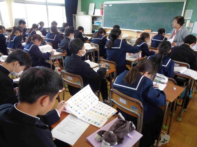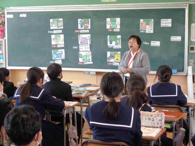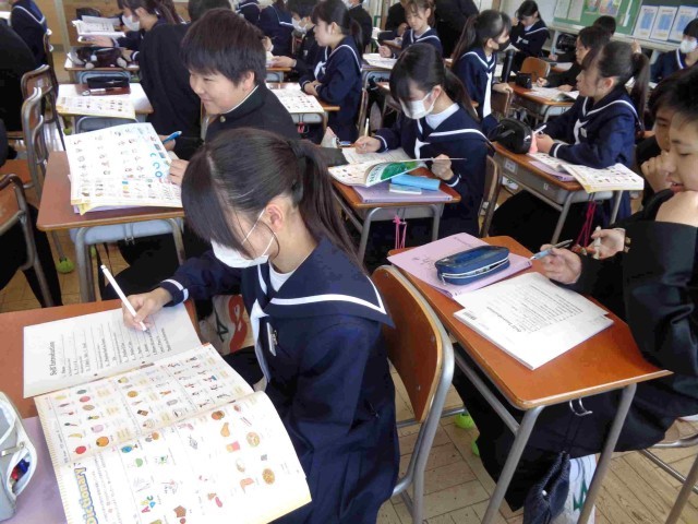 1年3組の英語の授業。ALTの先生に英語で自己紹介をするために自己紹介カードを書く活動をしていました。知っている英語をうまく使えるような自己紹介カードなので、わからない言葉を先生に質問しながら自己紹介を書いていました。好きな食べ物や苦手な食べ物など、答えやすいテーマなので、どんどんカートが埋まっていきます。最後に「好きな教科」の質問の仕方と答え方を全員で確認して、ペアで交流をしました。みんな意欲的にコミュニケーション活動に取り組めました。