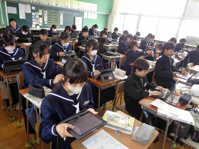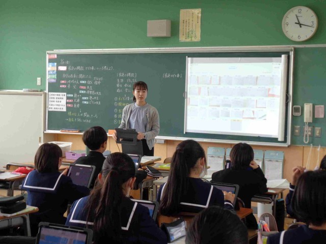 1年2組の家庭科の授業。「家庭の機能や仕事」について考えました。生活の基礎となる家庭生活について具体的に考えます。家庭の機能をみんなで確認した後、一人一人、家庭の仕事にはどんなものがあるのかを考えました。みんなよく考えてワークシートに記述でき、それぞれの記述をタブレットの機能を使ってみんなで共有しました。