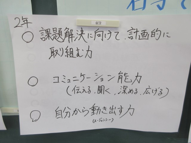 今日の校内研修は、「西中の生徒にどんな力をつけてもらいたいか」について、先生方が話し合いを行いました。西中の生徒の良いところと課題を出し合い、社会が求める力を参考に、生徒にどんな力を身に付けてもらいたいかを決めました。