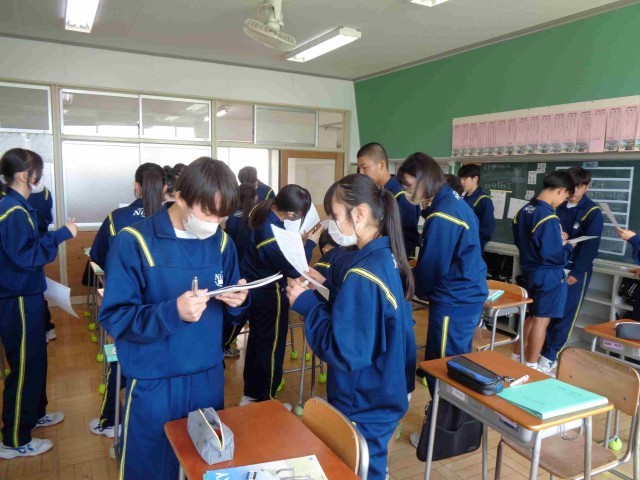 3年1組の英語の授業。2年生で習った表現をつかって交流活動をしていました。2年生では比較級や最上級、mustやwill、ifを使った表現などを学習したなあ、と思い出しながら友達とのコミュニケーション活動に積極的に取り組みました。