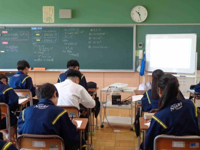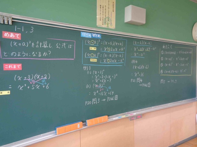 3年2組の数学。今日のめあては「(x+a)² を計算し、公式はどのようになるか」です。これまでの学習を使って計算をして公式を完成させます。先生からの課題にみんな集中して取り組み、最後にみんなで4つの乗法公式をまとめました。