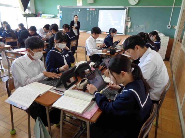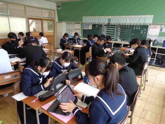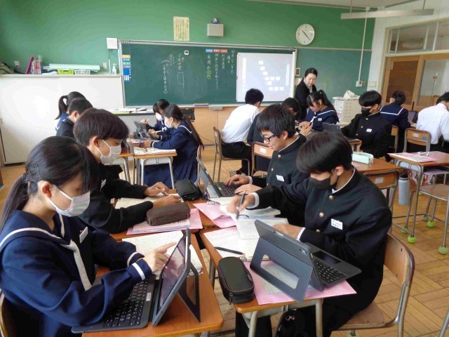 3年3組の国語は物語文「握手」を学習中。今日のめあては「物語の設定をとらえよう」です。グループで話し合い、タブレットで共有・交流をしました。どの斑もよく意見を交流できていました。