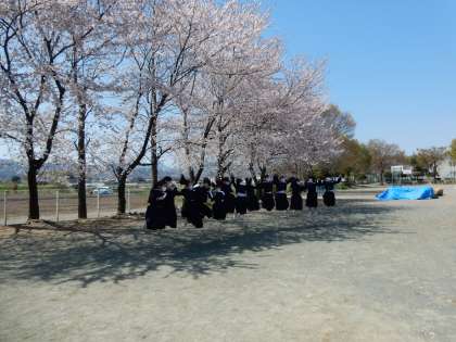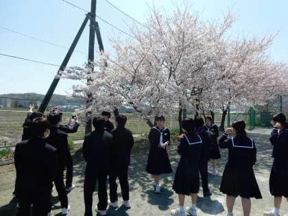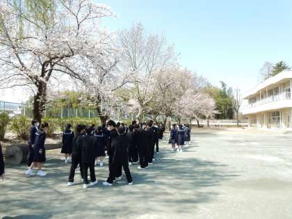 校庭東や南、テニスコート脇の桜が散り始めました。各クラス、花吹雪をバックに、記念写真を撮っていました。