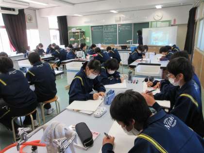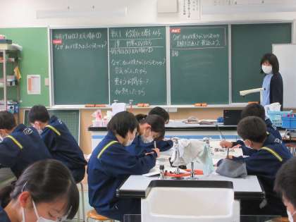 4月19日(火)授業の様子(2年3組理科) 公開日 2022/04/19 更新日 2022/04/19 今日の西中 2年3組は理科で化学変化について学んでいます。生徒は、前時にカルメ焼きを作り、カルメ焼きが膨らむ瞬間を見てきました。本時は、なぜカルメ焼きが膨らんだのか意見交流を行いました。次の授業では、実験を行い予想を検証することになりました。
