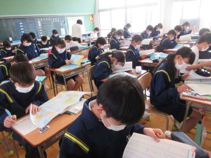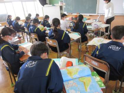 4月19日(火)授業の様子(1年3組社会) 公開日 2022/04/19 更新日 2022/04/19 今日の西中 1年3組は社会で、世界の国々について学んでいます。今日は、ヒントを頼りに、地図帳を見ながら、様々な国を探しました。「高原と砂漠の国。日本の相撲で活躍している人もいます」のヒントでは、多くの生徒が国を探し当てることができていました。
