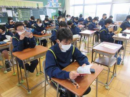 4月20日(水)朝読書の様子(2年1、2組) 公開日 2022/04/21 更新日 2022/04/21 今日の西中 各クラス、落ち着いた雰囲気で1日の始まりを迎えることができています。(上:1組、下:2組)