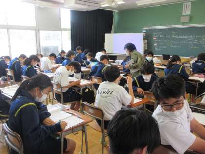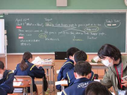 4月22日(金)授業の様子(2年4組英語) 公開日 2022/04/22 更新日 2022/04/22 今日の西中 2年4組は英語でWhenの表現方法について学んでいます。学び合いの場面では、友達と会話形式で表現の練習を行いました。