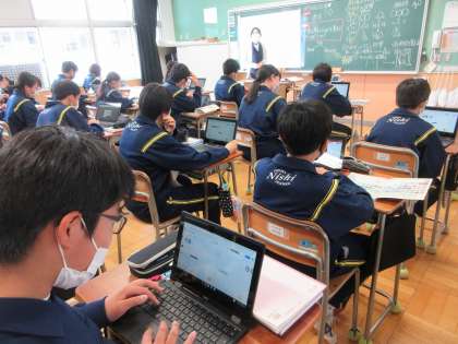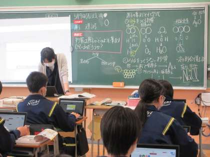 5月 9日(月)授業の様子(2年4組理科) 公開日 2022/05/09 更新日 2022/05/09 今日の西中 2年4組は、理科で原子と分子について学んでいます。授業では、物質は原子がどのように集まりできているか考えました。生徒は、PCで原子のモデルを操作しながら原子、分子についての理解を深めていました。