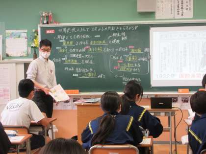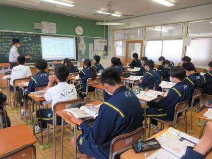 3年3組は社会で世界恐慌後の国際社会について学んでいます。生徒は風刺画から日本の軍国主義化について背景・原因についてまとめました。また、満州事変から国際連盟脱退までの経緯を整理しながら、日本の政治の変容についても考えました。様々な資料を読み取りながら、学習を進めていました。
