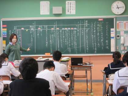 2年2組は、アイスプラネットという小説を教材に読解を行っています。今日は、場面ごとに登場人物の心情を考え、まとめました。生徒は、教科書を何度も読み返しながら、集中して考えていました。