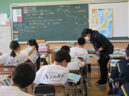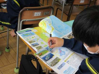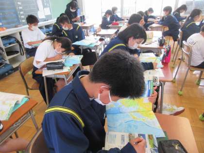 5月19日(木)授業の様子(1年3組社会) 公開日 2022/05/19 更新日 2022/05/19 今日の西中 1年3組は社会で日本の領域について学んでいます。領土、領海、領空について定義を理解するとともに、北端、東端、南端、西端の島を実際に地図帳で確認しました。